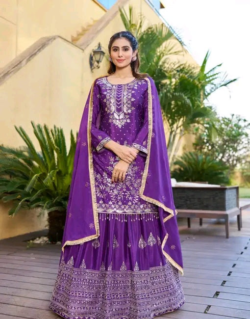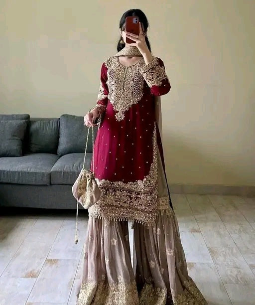 Karva Chauth Special Heavy Chinon Silk Embroidered Sharara Set with Dupatta